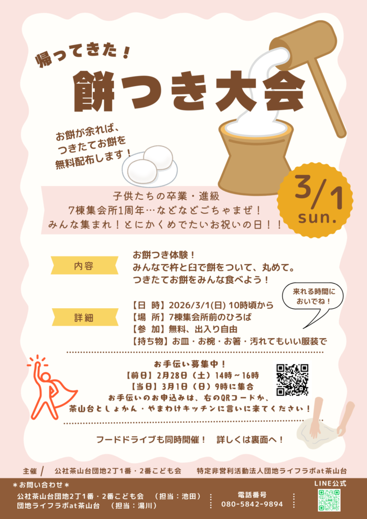 子どもたちの卒業・進級&7棟集会所1周年…などなど ごちゃまぜ!みんな集まれ!とにかくめでたいお祝いの日!久しぶりの「餅つき大会」を開催します!
